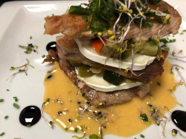 Milhoja de cerdo ibérico, queso de cabra, verduritas al vapor y crema castellana / Tierra de Sabor