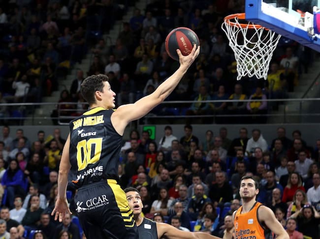 El base del Iberostar Tenerife Rodrigo San Miguel (i) entra a canasta en el partido ante el Valencia Basket de la novena jornada de la Liga Endesa. E / CRISTÓBAL GARCÍA (EFE)