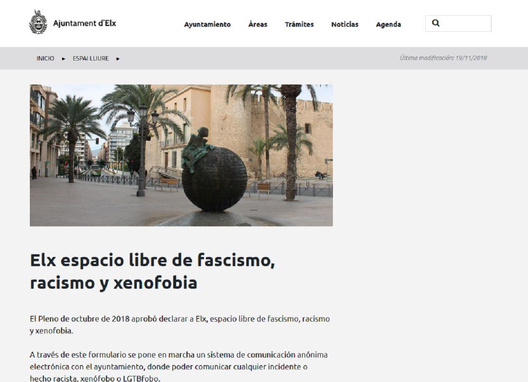 Participación pone en marcha el espacio web "Elx, espacio libre de fascismo, racismo y xenofobia". El objetivo es que la ciudadanía pueda denunciar actos de odio que se produzcan en Elche.
