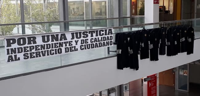 El gran hall de entrada de los juzgados de Ciudad Real estaba presidido de nuevo por una decena de togas colgadas que sirven de emblema de las protestas. Junto a éstas una pancarta en la que se podía leer "Por una justicia independiente y de calidad al servicio del ciudadano".
