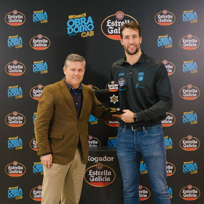 Esta mañana se ha hecho entrega en la pista del Multiusos Fontes do Sar del premio al Jugador Estrella Galicia del mes de octubre del Monbus Obradoiro. Este galardón, que es el primero de la temporada, ha recaído en el pívot Nacho Llovet y ha sido entregado por el delegado de Hijos de Rivera en Santiago de Compostela, Guillermo Fernández.