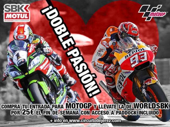 Siguiendo con las novedades, esta vez centradas en el mundial de Superbike, los aficionados también tendrán ocasión de vivir una doble pasión con Jerez. Y es que todo aquel que compre cualquier tipo de entrada del Gran Premio Red Bull de España, podrá adquirir por sólo 25 euros más su entrada (con paddock incluido) para todo el fin de semana del Campeonato del Mundo de Superbike que se disputará del 7 al 9 de junio del año próximo. Para aquellos interesados exclusivamente en el mundial de las motos derivadas de serie, a partir del día 23 también estarán disponibles las entradas que podrán ser adquiridas bien para todo el fin de semana, bien por día.