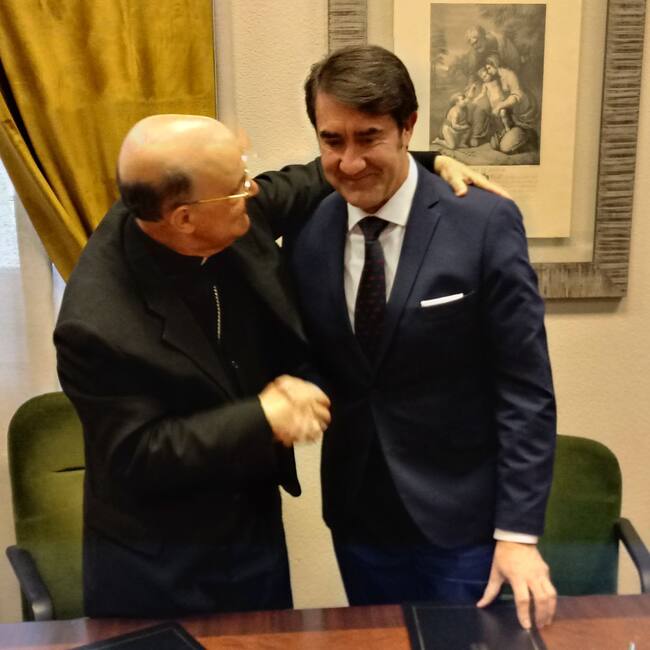 El arzobispo de Burgos, Fidel Herráiz, tras la firma del convenio con el consejero de Fomento, Juan Carlos Suárez-Quñones / Radio Castilla