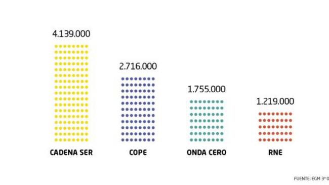 A nivel nacional, la SER cierra 2018 con el liderazgo absoluto de la radio española. Sube su audiencia y alcanza los 4.139.000 oyentes de lunes a viernes. La SER es líder en informativos, deportes, entretenimiento y humor, ya que todos sus programas ocupan las primeras posiciones, de lunes a domingo sin excepción. En la radio musical, Los40 y Cadena Dial ocupan las dos primeras posiciones.
