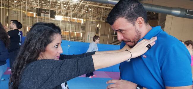 En la sala de artes marciales han aprendido técnicas de autodefensa como el mantenimiento de la distancia de seguridad, inmovilizaciones o la respuesta a un agarre que pueda bloquearles las vías respiratorias, como nos ha confirmado Raúl del Olmo, supervisor de Formación Continua del Hospital Severo Ochoa.