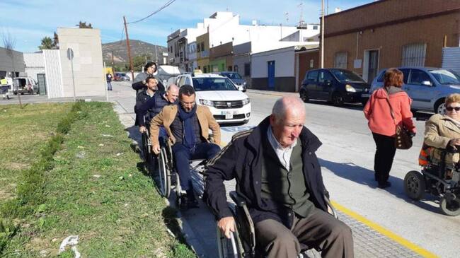 El alcalde de La Línea Juan Franco y otros miembros de la corporación se han desplazado en silla de ruedas y han comprobado los impedimentos a los que se enfrentan las personas con discapacidad. / Ayto. La Línea