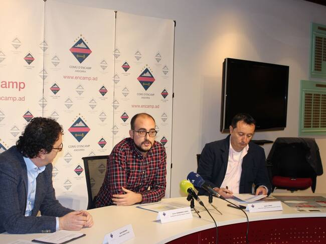 Betim Budzaku, gerent d'Andorra Turisme; Xavi Fernández, conseller de Joventut i Esports del comú d'Encamp; i Ignasi Vinós, director del departament de Joventut i Espors del comú d'Encamp, durant la presentaclió de la 27a edició del Saló de la Infància. / Comú d'Encamp