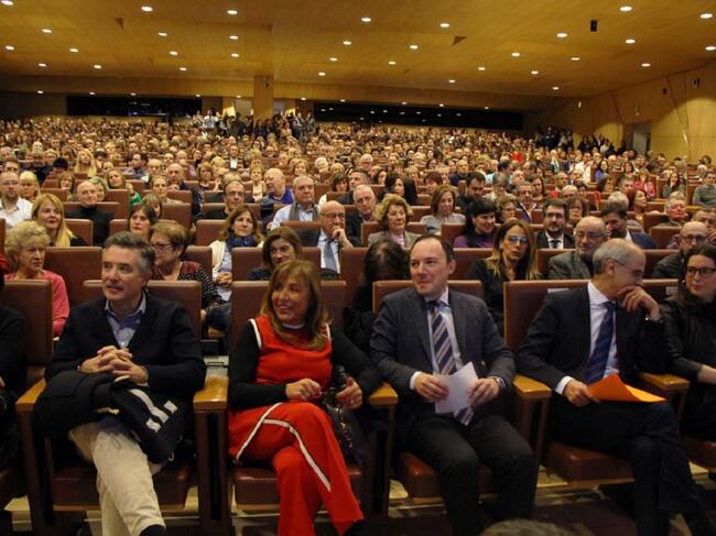 El candidat a cap de Govern de DA, Xavier Espot (al centre) acompanyat de les principals autoritats demòcrates com Antoni Martí, Conxtia Marsol o Vicenç Mateu, i davant un miler de persones que omplien de gom a gom el centre de congressos en l'acte de pre / T.N. (ANA)