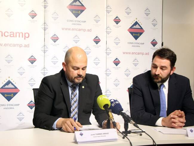 El cònsol major d'Encamp, Jordi Torres, i el conseller Jordi Rogel en la roda de premsa posterior al consell de comú. / T.N. (ANA)