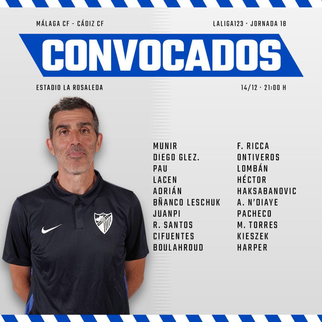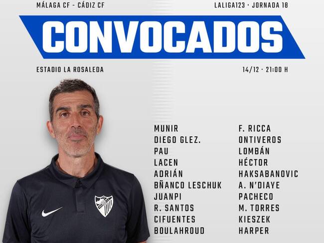 El técnico del Málaga, Juan Ramón Muñiz, convocó a 20 jugadores para el partido de esta noche (21 horas) ante el Cádiz