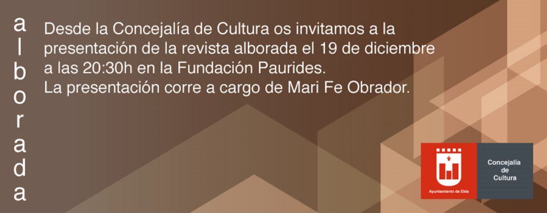 La Fundación Paurides de Elda acoge este miércoles, a partir de las 20:30 horas, la presentación de la 61ª edición de la revista Alborada, a cargo de Marifé Obrador. La portada de esta edición, que cuenta con 124 páginas, es obra del pintor Joaquín Planelles.