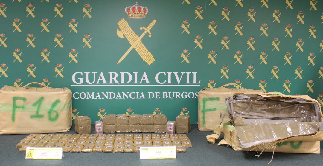 En las proximidades se encontraron los bultos abandonados por el conductor, 3 paquetes a modo de fardos de 30 kg cada uno, que contenían diferentes tabletas más pequeñas de hachís, en total 90 kg.