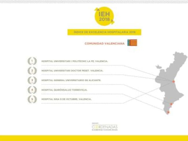 El resto de centros valencianos se mantiene sin grandes fluctuaciones respecto a 2017. Así, en segunda posición repite el Hospital Universitari Doctor Peset de Valencia, mientras que en la quinta posición se mantiene también el Hospital Nisa 9 de Octubre. El único cambio es la subida del Hospital General Universitario de Alicante, del cuarto al tercer puesto, mientras que la cuarta posición pasa a ocuparla el Hospital Quirónsalud Torrevieja, situado en tercer lugar en 2017.