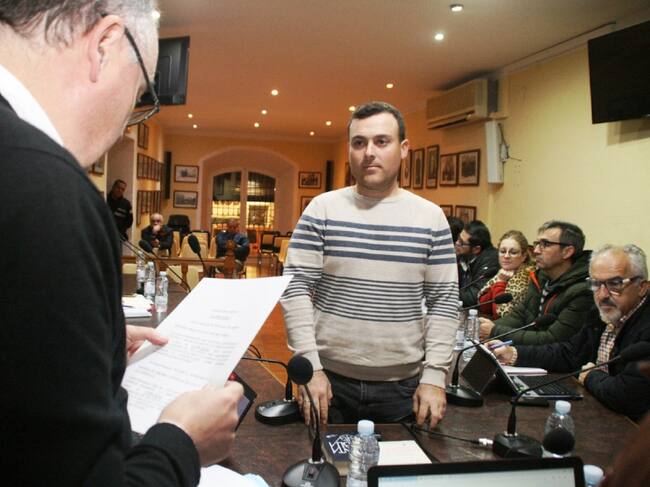 Juan Antonio Martínez en el momento de la toma de posesión de su cargo ante el resto de concejales de la corporación municipal de Villanueva del Arzobispo. El secretario municipal formaliza el acto mientras el nuevo edil escucha sus palabras. / RADIO VILLACARRILLO