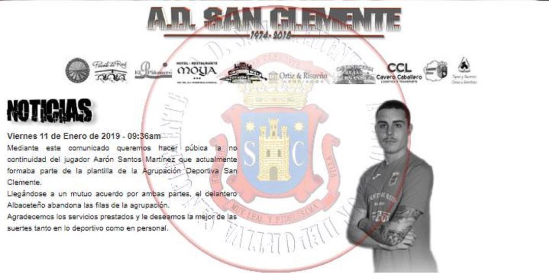 Aarón ya no seguirá vistiendo la camiseta del AD San Clemente, tras un buen comienzo en cuanto a goles y juego, el club ha decidido prescindir de sus servicios y darle la baja. El buen rendimiento de Campillo y la llegada de Gustavo Porras han sido los detonantes para tomar esta decisión.