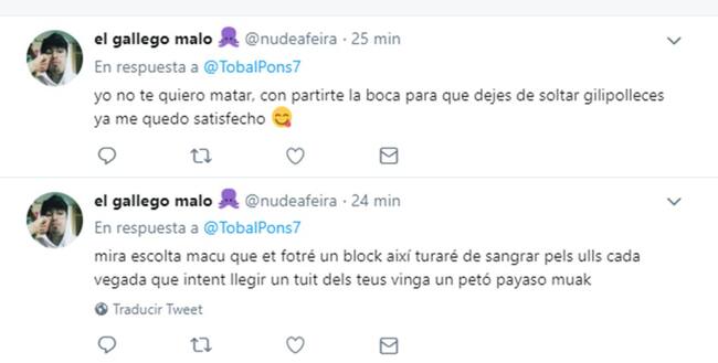 Este lunes por la noche, al hilo de un twit publicado por el usuario @nudeafeira en el que se hacía referencia al cierre temporal de la sede de Vox en Menorca, el miembro de NNGG recibió una serie de amenazas e insultos por parte de este usuario.