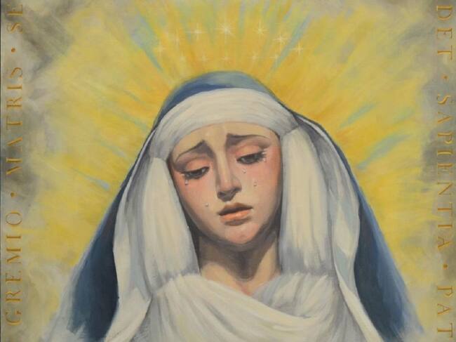 De formato cuadrangular, en el cartel aparece el semblante de la dolorosa rodeado de resplandores dorados y enmarcado por la leyenda en latínIn gremio Matris sedet Sapientia Patris”: en el regazo de la Madre está la Sabiduría del Padre.