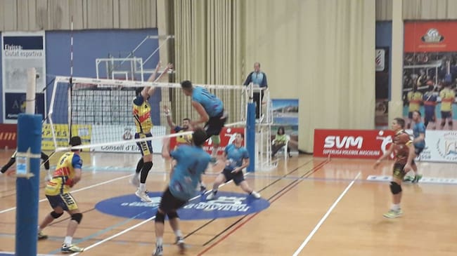Los locales arrancaron con fuerza, hasta colocarse con un 6-2 en el primer set gracias al acierto de Tapia y Del Carmen. Intentó reaccionar Río Duero, pero seguía el acierto del equipo local en el que todas las piezas sumaban, con remates de Salerno, bloqueos de Sugrañes y hasta un ace de César, con algo de fortuna ya que tocó red, que dio el 12-7 al equipo ibicenco. La ventaja no paraba de crecer. Sugrañes hacía daño en el saque y en los últimos puntos, el dominio en la red hizo el resto, con un bloqueo de Sugrañes cerraba el primer parcial en 25-16