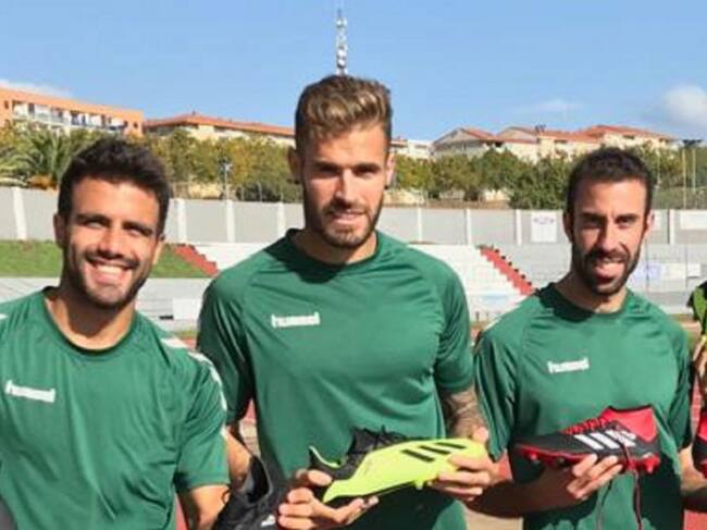 Rodrigo Flórez -en el centro- con algunos compañeros en el Plasencia. / Plasencia