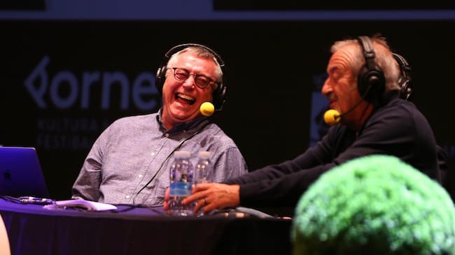 Para Michael Robinson los “derbis no acaban nunca”. Pero no es una frase hecha sin más, porque lo demuestra con hechos, componiendo un ‘Acento Robinson’, el programa que presenta los domingos en la SER, en el que se rodea de cocineros, músicos, bertsolaris, el escritor argentino Martin Caparrós y la leyenda de la Real Sociedad, Alberto ‘Bixio’ Gorriz. “Un Derbi vasco empieza en un terreno de juego, pero trasciende a otros ámbitos de la cultura Vasca. A mí me encantan cómo se viven los derbis los vascos, porque no hay crispación, lo que hay es rivalidad, y la rivalidad no es mala”, comienza diciendo Robinson, que pide explicaciones a Martin Caparrós por su famosa frase sobre el futbol: “El fútbol es el éxito más innecesario de la civilización”. Con su flema inglesa, el ex jugador le espeta: “¿Cómo así dices eso?”. El escritor argentino responde divertido: “Estoy convencido de que si no hubiera existido, nadie hubiera echado de menos ni hubiera pedido el fútbol”. Acompañado de su hijo, Liam Robineson, con el que bromeó diciendo que sí pudo jugar en el Athletic porque nació en Pamplona. "Tú no podías, pero yo sí, es verdad, pero era muy malo", le respondió Liam. A lo que Robinson le matizó: "Para ganarte a este público tenias que haber dicho que precisamente porque eras malo, tenías que haber jugado en el Athletic". Risas generalizadas.
