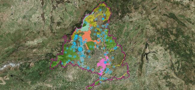 Situación de las fincas para bodas en la Comunidad de Madrid (azul) y areas protegidas coloreadas según tipo / Ecologistas en Acción