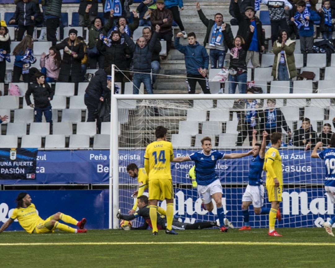 La respuesta del Oviedo fue casi inmediata y llegó el primer gol del partido. Fue Carlos Hernández el que ponía el uno a cero en el marcador. El gol llegaba tras un saque de esquina que Cifuentes rechazaba y que el central asturiano acabó siendo más rápido, listo y atento que los defensores del Cádiz.