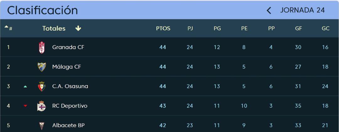 Tras haberse esfumado la opción de situarse en el primer lugar, la tabla queda comprimida al máximo, con cinco equipos en dos puntos de diferencia. Los coruñeses pierden un puesto, ahora sin cuartos, al verse superados por Osasuna. Los pamplonicas batieron al líder Granada y cada día se confirman aún más como candidatos a todo. Pese a la derrota, Granada sigue liderando la clasificación con 44 puntos, los mismos que Málaga (44) que es segundo y que Osasuna (44) que es tercero. El Dépor baja al cuarto puesto con un punto menos (43) y aventaja al quinto, Albacete (42), también en un punto.