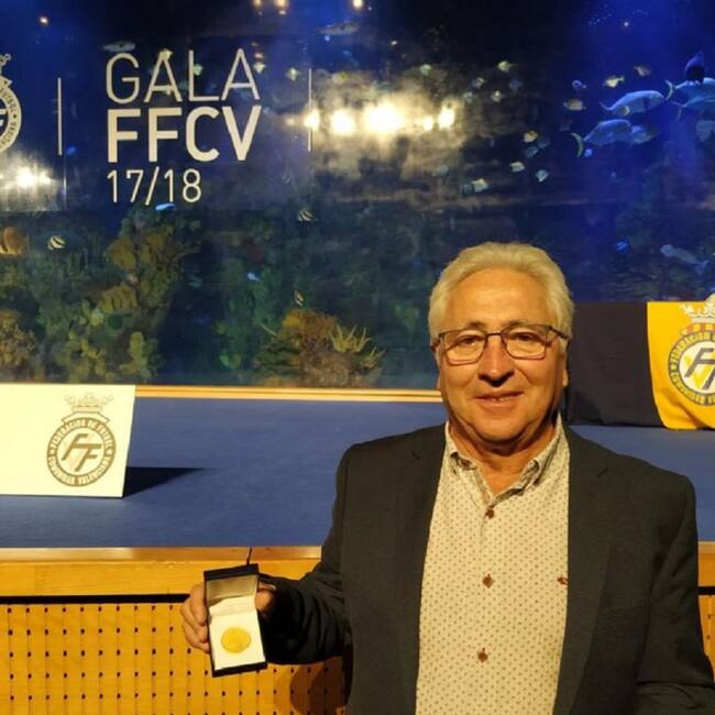 Enrique Cervera posa con la medalla de oro en la Gala de la FFCV / Kelme CF