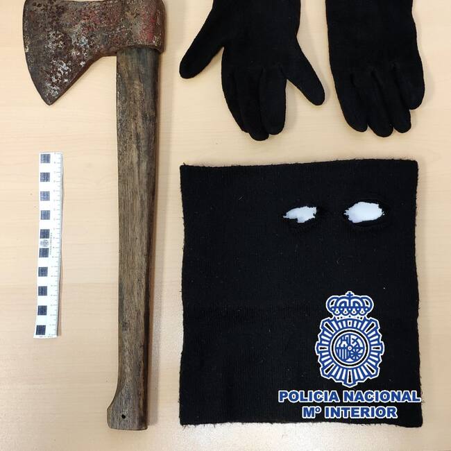 El hacha, junto al resto de materiales, incautados al detenido / Policía Nacional