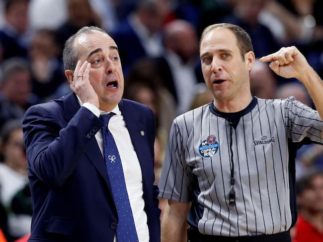 El entrenador del Iberostar Tenerife, Txus Vidorreta (i), conversa con uno de los colegiados durante la primera semifinal de la Copa del Rey de baloncesto ante el Barcelona Lassa que se disputa esta tarde en el Wizink Center, en Madrid. / Sebastián Mariscal (EFE)