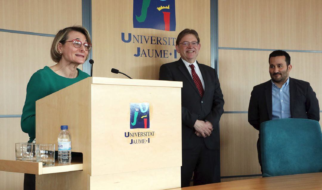 La rectora de la Universitat Jaume I, Eva Halcón, ha explicado los detalles de las obras en una comparecencia en el edificio del Rectorado, acompañada por el president de la Generalitat, Ximo Puig y el conseller de Educación, Vicent Marzà.