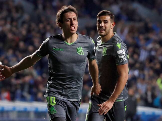 Oyarzabal celebra uno de sus dos goles en la última victoria realista / Javier Etxezarreta (EFE)