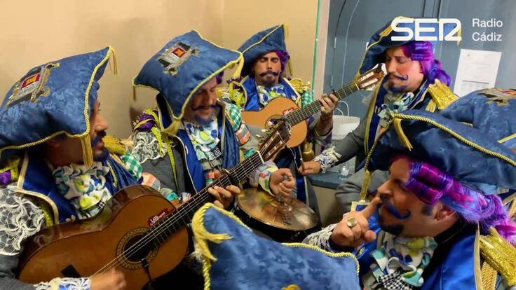 La instrumentación de la comparsa de David Carapapa interpreta para Radio Cádiz el final del popurrí junto a varias voces y coreaos
