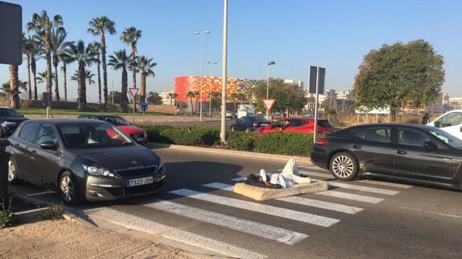 Un hombre ha protestado este lunes en Castellón tumbado en un colchón en un paso de cebra ubicado en la rotonda próxima al Cuerpo Nacional de Policía. Al parecer, la protesta se ha producido por problemas administrativos en materia de extranjería.