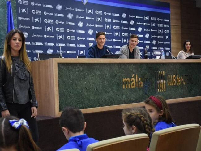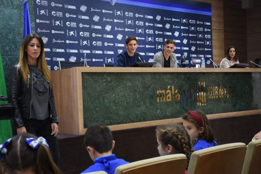 Los jugadores del Málaga Pau Torres e Iván Alejo, estuvieron hoy en la sala de prensa del estadio de La Rosaleda con un grupo de trece chicas y chicos de cinco a doce años que ejercieron de periodistas y entrevistaron al defensa y al centrocampista.