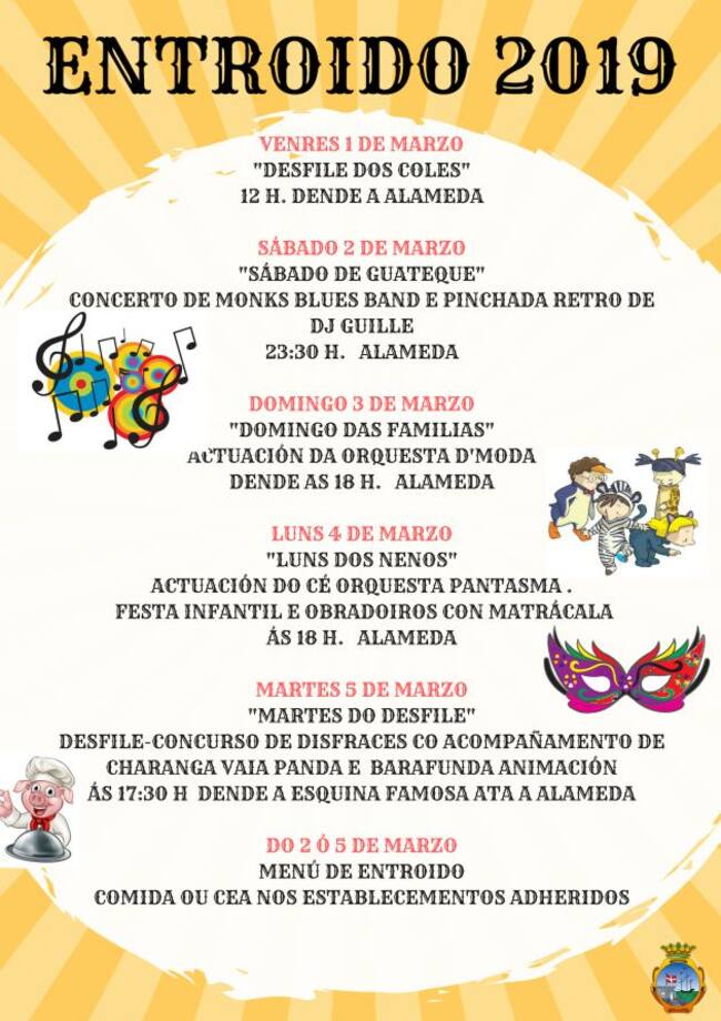 Entre medias, de sábado a martes, habrá actuaciones musicales, que en esta edición correrán a cargo de "Monk Blues Band", "DJ Guille", "Orquestra D´Moda" y "CÉ Orquestra Pantasma". Además, habrá un menú de entroido especial en seis establecimientos de hostelería de la villa, que incluye un primer plato de caldo o empanada, un segundo de lacón con grelos y filloas o orejas de postre. Todo ello por 18 euros, incluída la bebida y el cafe.