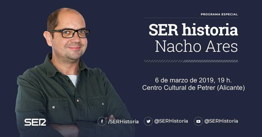 Este miércoles Nacho Ares, el presentador del programa nacional SER Historia de la Cadena SER, realizará la grabación del SER Historia desde el centro Cultural de Petrer a las 19:00 horas con motivo de la celebración de los 80 años del fin de la Guerra Civil.