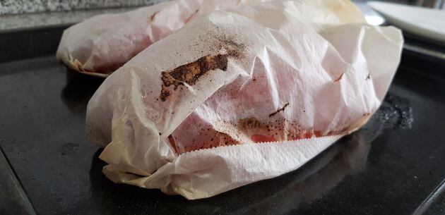 Seguidament els omplirem però sense pressionar, i els embolicarem amb el paper sulfuritzat. Punxem un parell de vegades amb el ganivet en cada pimentó per a que entre bé la calor. Introduïm en el forn durant 1 hora i 15 minuts.