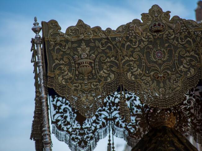 Detalle de la bambalina trasera del palio de la Virgen de La Aurora de la Hermandad de La Resurrección / @ResurreccionSev