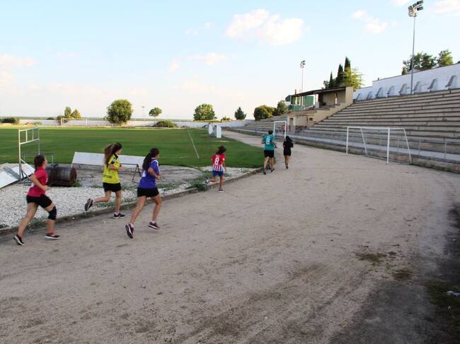 Un grupo de deportistas corre por las pistas de atletismo en el campo de fútbol de Cuéllar(Radio Cuéllar)