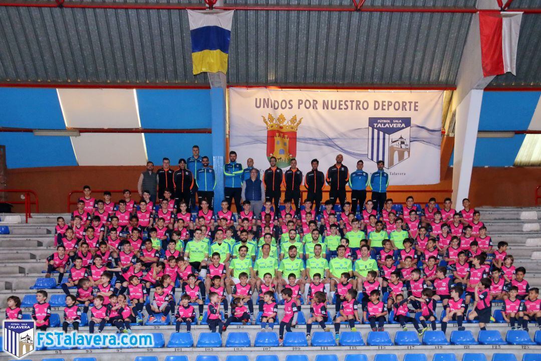 De menor edad a mayor, desde los Chupetines hasta los Juveniles, fueron posando para la foto de equipo y colocándose en un lugar privilegiado de la grada donde todos formarían una foto de familia en la que también estuvo presente el primer equipo talaverano.