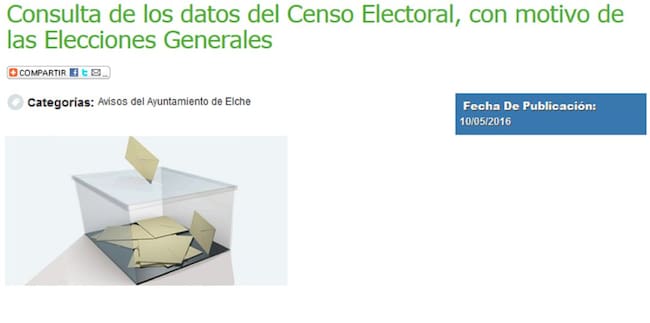 Cualquier persona empadronada en Elche puede consultar ya su inscripción en el censo y comprobar donde tiene que votar y si los datos son los correctos a través de la web del ayuntamiento de Elche, en la portada de Elche.es.