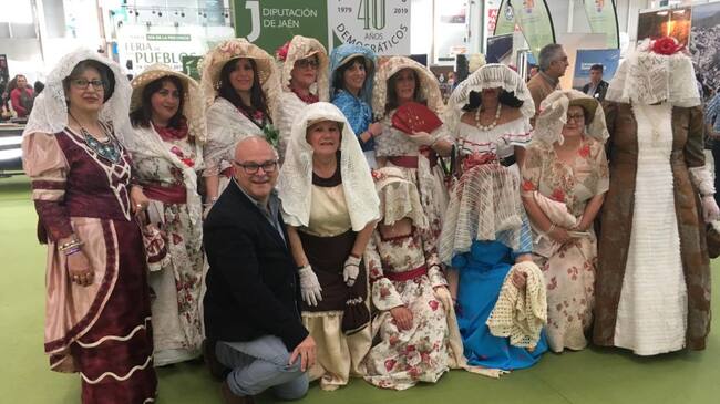 Manuel Fernández con vecinas de Rus disfrazadas durante la Feria de los Pueblos. / Diputación de Jaén