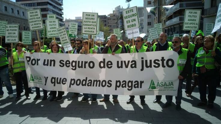 Con una sonora concentración alrededor de 200 productores de la uva de mesa del Vinalopó han pedido, ante subdelegación del Gobierno en Alicante, que se comprometa a "frenar" la subida de las primas de Agroseguro en este año. La media de incremento está en algo más del 50 %, lo que hace que sea prácticamente "inaccesible" para el agricultor y lo convierte en "un producto de lujo" y los deja "indefensos" ante los siniestros.
