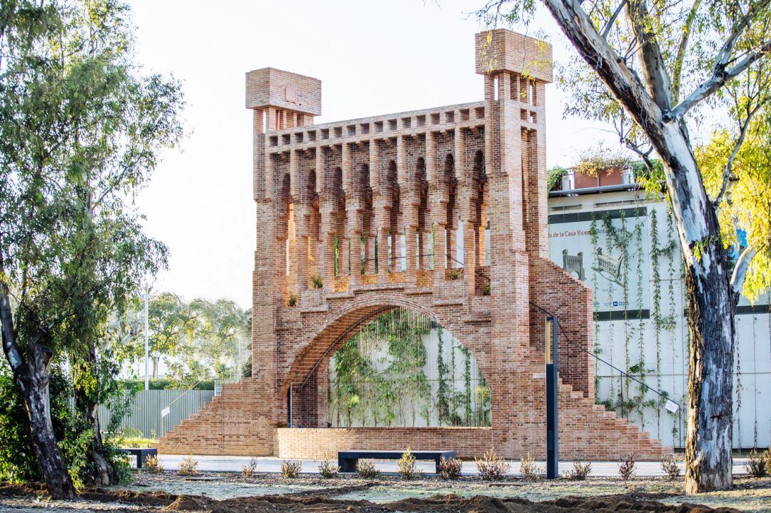 La cascada està feta de maons, fa 10 metres d'alçada i 10 d'ample, té dos pilars i un arc sobre el qual es pot caminar. Ara és als jardins del Museu de les Aigües que Agbar té a Cornellà, però entre 1884 i 1945 va ser al jardí de la Casa Vicens, que era la casa d'estiueig de la família Vicens a Gràcia. "Tots els maons estan fets a mà, s'han seguit les mateixes tècniques constructives de l'època" ha explicat el redactor del projecte de reconstrucció, Josep Gómez Serrano.