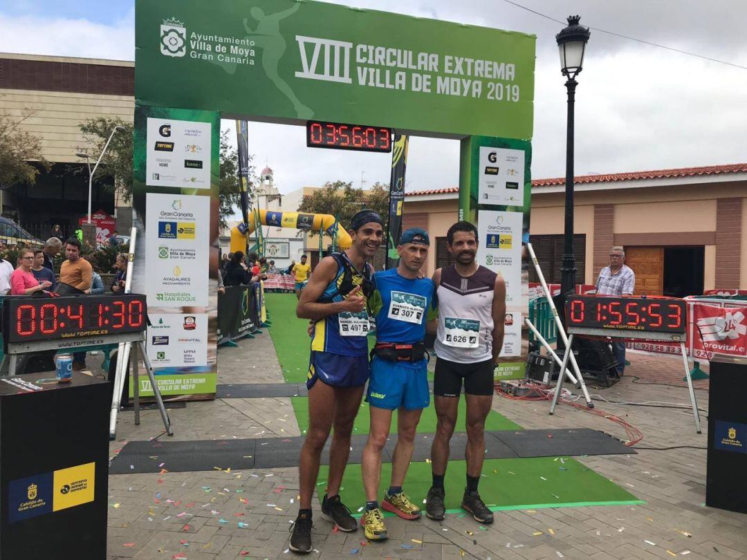 Con unos trazados excepcionalmente secos, pues no se han registrado precipitaciones recientes en la Villa de Moya, y con una climatología agradable e invertida a lo que suele ser habitual, con nubosidad en la parte baja del municipio y sol espléndido en la parte cumbrera, la octava edición de la Circular Extrema Villa de Moya transcurrió sin incidentes y estrenando vencedores en la categoría Maratón, de 42 kilómetros. El corredor llegado desde La Aldea de San Nicolás, Javier Sosa, se hizo por primera vez con el título de esta modalidad, tras atravesar el arco de meta con una marca de 04:04:16, casi siete minutos menos que su cronometraje del año pasado, en el que fue tercero; mientras que el andaluz Amador Perena, sargento del ejército destinado temporalmente en Gran Canaria y subcampeón de Andalucía, cerró en la segunda posición su debut en esta trail, con 04:11:27, seguido por el moyense Dani Santana, quien registró 04:15:35. En la categoría femenina, Nira Castro logró la primera posición, con un tiempo de 05:58:27, seguida en el podio por Carmen Quesada y Mari Carmen García, con sendas marcas de 06:43:14 y 06:47:52, como segunda y tercera clasificada.