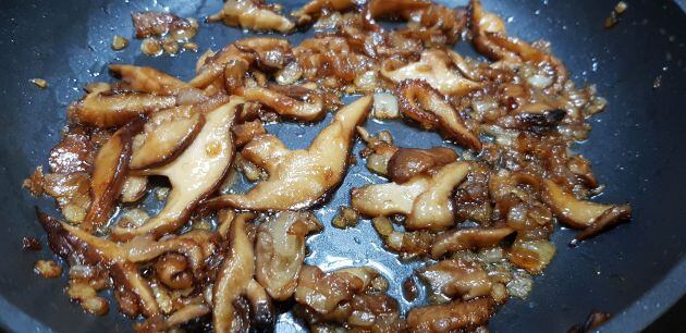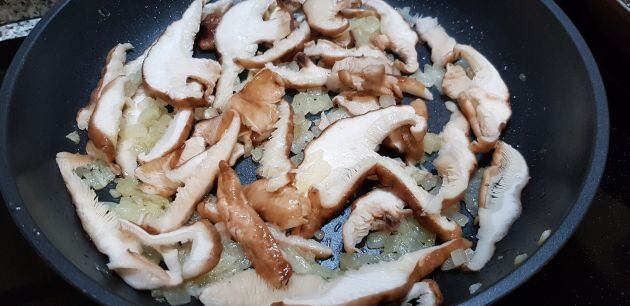 En primer lloc hem de tallar finament la ceba y l'escalfarem en una paella amb una miqueta d´oli o mantega. Després n'afegirem els xampinyons. Li tirarem una miqueta de brandi o conyac i flamejarem. Rectifiquem de pebre i sal.