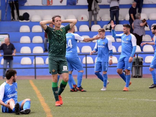 El CD Guadalcacín celebra uno de sus goles ante la desesperación de un jugador del Betis / Simón Parra