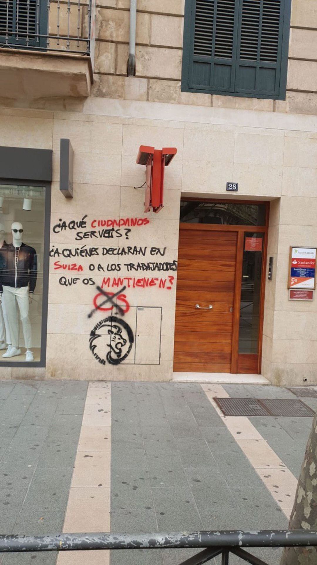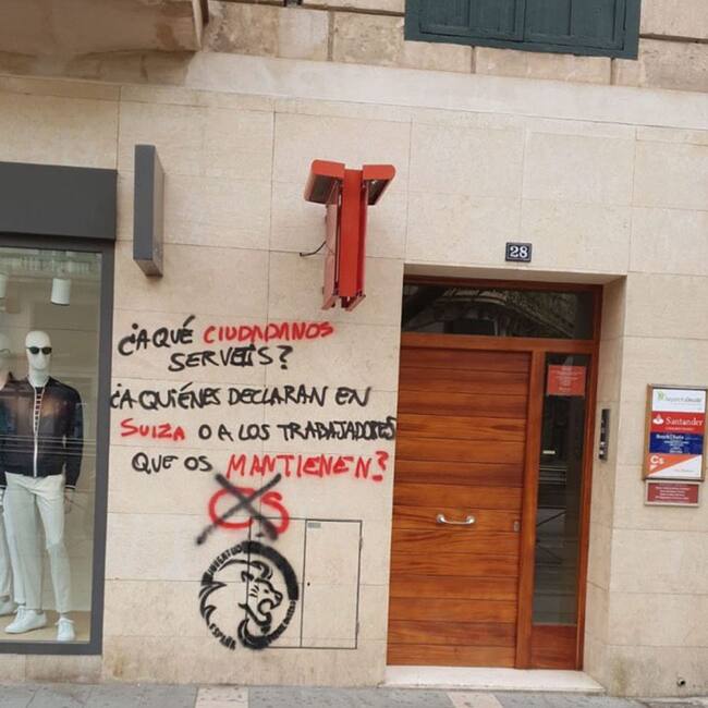 La sede de Ciudadanos en Palma ha aparecido este domingo con una pintada en la que se puede leer el mensaje "¿A qué ciudadanos servís? ¿A los que declaran en Suiza o a los trabajadores que os mantienen?", seguido de las siglas del partido tachadas con una cruz.