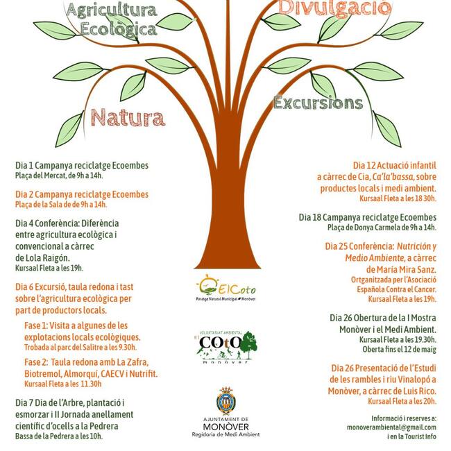 Así, durante todo el mes se han programado diferentes actividades de concienciación que van desde el reciclaje, la agricultura ecológica, paseos por la naturaleza, de difusión y divulgación de investigaciones hasta excursiones. Habrá campañas, conferencias, celebración del Día del Árbol e incluso una actuación infantil o una muestra sobre Monóvar y el Medio Ambiente.